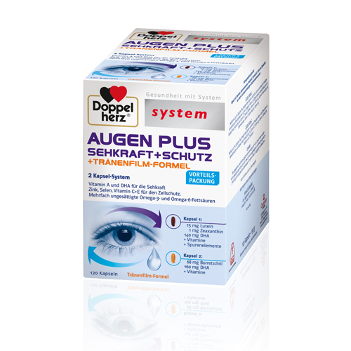 Double Heart Augen plus Sehkraft + Schutz Syst. 120 Kps. system AUGEN PLUS SEHKRAFT + SCHUTZ + TRÄNENFILM-FORMEL enthält in zwei Kapseln: